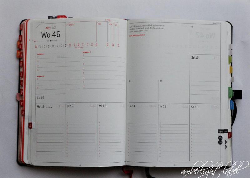 Tatsächlich hilft mir die Fokussierung auf jeweils eine Woche sehr. Nicht alle Termine sind 2019 in diesem Kalender gelandet, denn Grundlage bleiben die sieben vernetzten Onlinekalender, bei denen jedes Familienmitglied ein eigene Farbe hat und es außerdem noch einen gemeinsamen Terminkalender und für mich einen beruflichen gibt. Nur der Doktorarbeitskalender ist inzwischen glücklicherweise ausgeblendet. Ich nutze aber die Wochenstruktur für die Aufgabenliste, die Jahresübersicht für die Grobsortierung, die Qaurtalsübersichten und die vielen Tabellenmöglichkeiten im Businessteil für private Listen und berufliche Notizen. Die Kombination von digital und analog mag ich sehr.