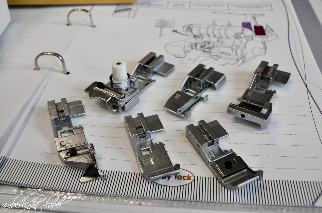 Der zweite Kurstag war für mich selbst am spannendsten, denn dort lernte ich nicht nur einiges zu den Coverlocknähten, bei denen ich beispielsweise noch nie die Anfangsfäden einfach abgeschnitten habe, sondern man probierte vor allem jede Menge Füßchen aus. Neben dem Bandeinfasser* – für das ich passend zu meiner Maschine die Variante ohne Führungsrechen bekam – probierten wir das Coverlockfüßschen-Set* komplett durch. Dazu gehörten der Paspelfuß 5 mm, Blindsaumfuß, Perlenfuß, Gummibandfuß, Spitzenfuß und Kräuselfuß, von denen ich selbst bislang nur mit dem Paspelfuß arbeite. Nicht alle Füßchen werden auf meine eigenen Wunschzettel wandern, denn beispielweise der Perlenfuß näht zwar sehr faszinierend die Perlen an, aber diese sind Plastikkügelchen, was nicht zu unserem möglichst plastikfreien Haushalt passt. Der Blindsaumfuß hingegen, der zwar keine wirkliche Blindstichnaht näht, ermöglicht eine Flatlocknaht, die ganz neue Möglichkeiten für die Schlüpfernäherei eröffnet.