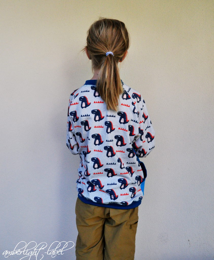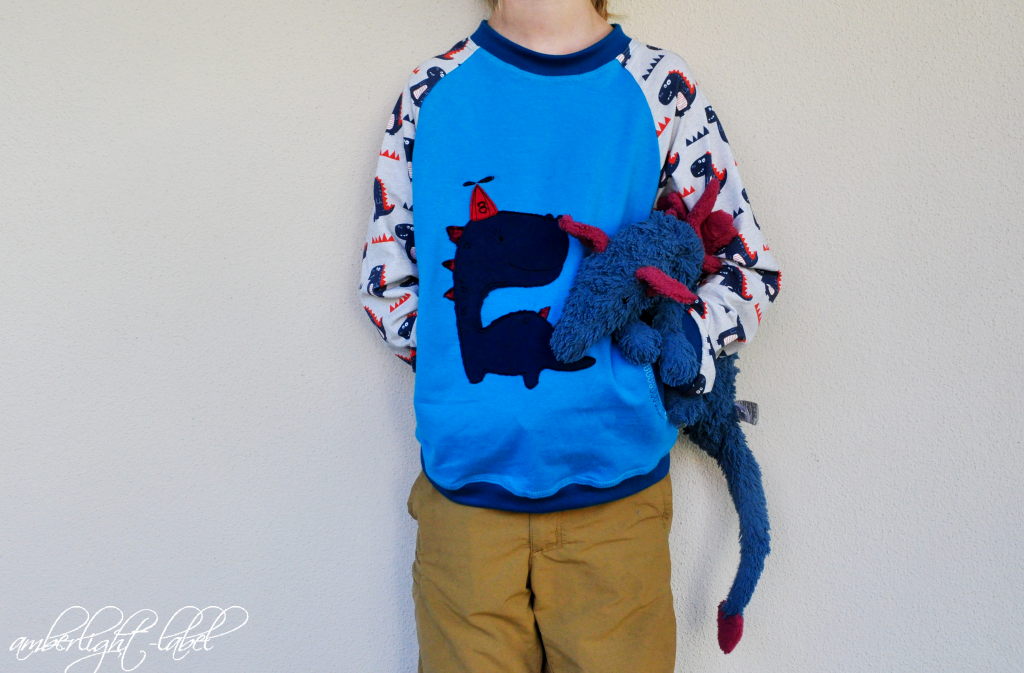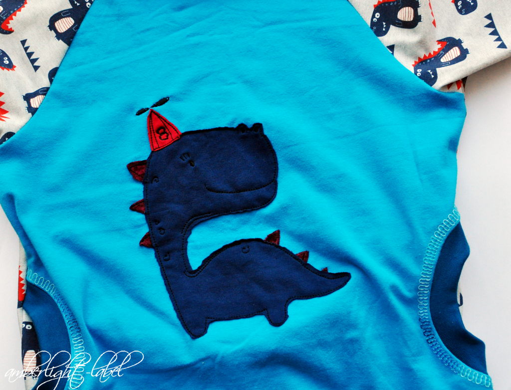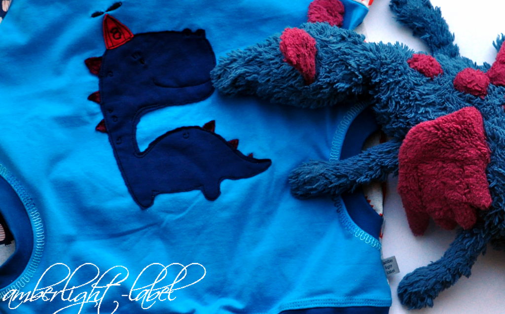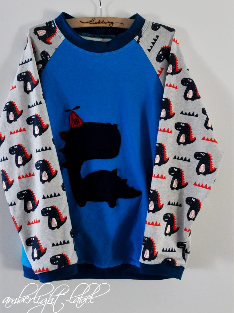 Die neue Coverlock baby lock Primo zauberte ganz wunderbare Nähte und meisterte zuverlässig auch alle Nahtübergänge. Das Nählabel ist von Dortex. Sie Stickdatei gab es für den großen Bruder sechs Jahre davor bei seinem 6. Geburtstag. Die Drachen-Dinosaurier-Applikation Happy Dino Doodle von Ritterkind gehörte zu meinen zahlreichen Käufen bei Makerist. Den Shop von Ritterkind scheint es leider inzwischen – wie so viele – nicht mehr zu geben. Das fantastische am Maschinensticken ist, dass man den Drachen ganz nach eigenen Vorstellungen gestalten kann und das Geburstagskind sehr von seinem Dino-Dachen-Pullover mit der Ähnlichkeit zum Liebelingskuscheltier begeistert war.