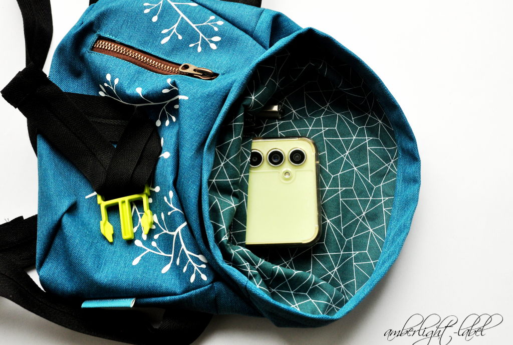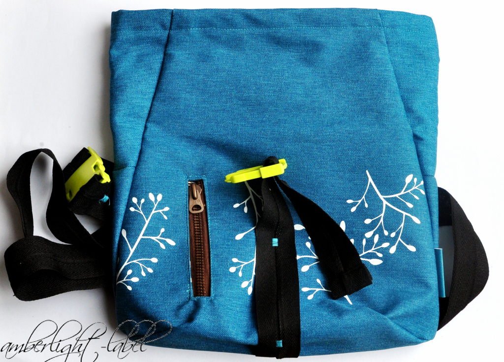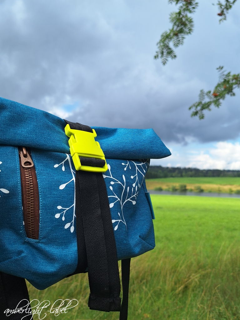 Genäht habe ich die kleinste Variante und dafür den vorletztes Jahr für ein nie erschienenes Rucksack-Schnittmuster von Lange-Hand gekauften Outdoorstoff Julian Light von Snaply angeschnitten, der dafür wirklich perfekt passt. Der Stoff ist wasserabweisend und nach Herstellerangaben abriebfest. Da es bei einem Probenähen aber ein bisschen besonders sein sollte, habe ich den Stoff mit den grafischen Zweigmotiven von DerLillyDesign* beplottet. Die Plotterserie “Blommadings”, die es ursprünglich bei Makerist gab, fehlt aber aktuell noch im Etsy-Shop.