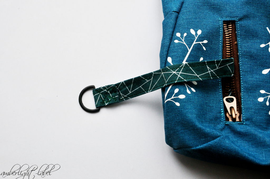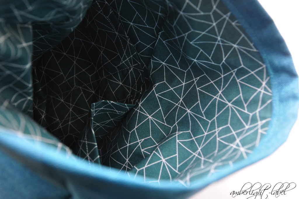 Im Inneren und auch beim Schlüsselband habe ich einen grafischen Stoff vernäht, den ich in Merseburg bei meinen Schwiegereltern im einfach-meinfach gekauft, aber hier bei der Stoff-Sucht noch gar nicht gezeigt habe. Das Petrol ist nicht ganz perfekt als Kombifarbe, aber ich fand es dennoch passend. Das Nählabel von CottonTrends harmonierte hingegen farblich perfekt. Bei den Reißverschlüssen wie auch beim Gurtband habe ich endlich mal die Bestände aus der Schneiderei-Auflösung in Kamenz weiterverarbeitet. Die Metallreißverschlüsse hatten die richtige Länge und gefallen mir an der Tasche. Das Gurtband musste ich allerdings mühsam doppeln, um die gewünschte Breite zu bekommen.