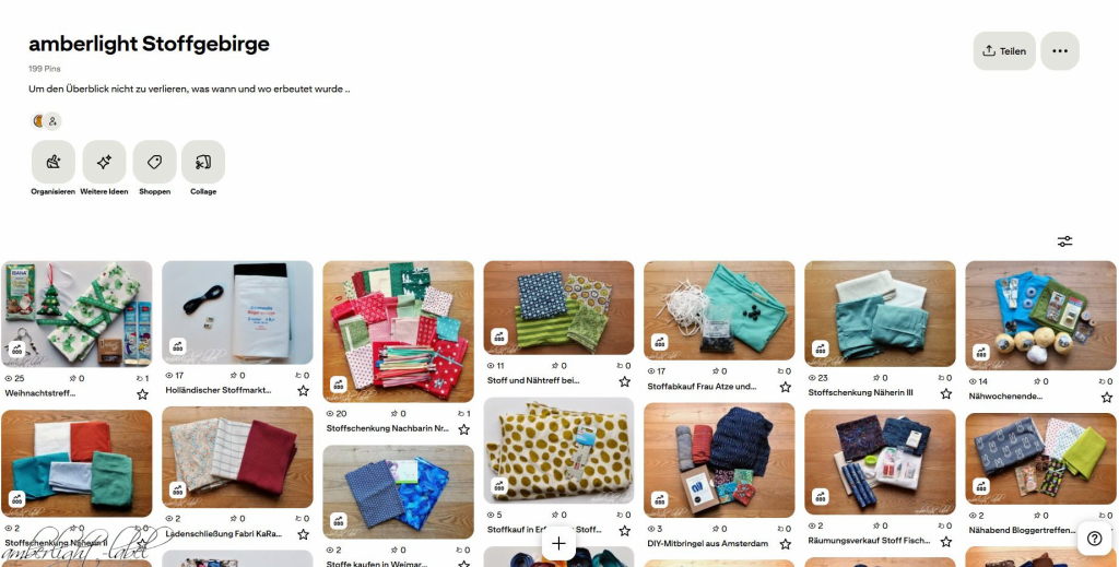 Als viertes “Programm” nutze ich beim Schreiben der Blogbeiträge auch noch “das Internet”, denn in den meisten Fällen recherchiere ich zum jeweiligen Thema, ergänze sinnvolle Links oder suche nach der richtigen Adresse, um meine Erlebniskarte füllen zu können. Für meine Stoffgeschichten brauche ich außerdem mein eigenes angelegten Stoffgebirge bei Pinterest. Nur darüber finde ich den jeweiligen Stoff recht schnell wieder, springe dann via link zum eigenen Blogbeitrag und weiß damit wieder, welche Stoffgeschichte ich damit verbinden kann.