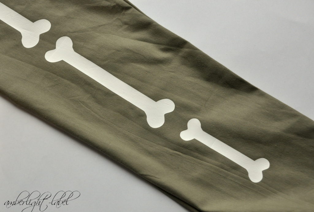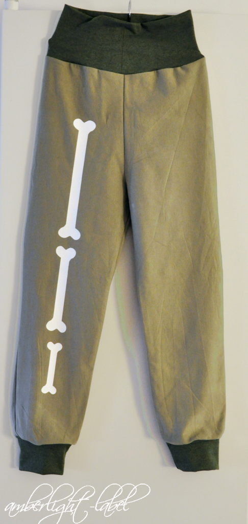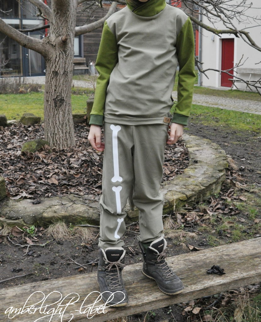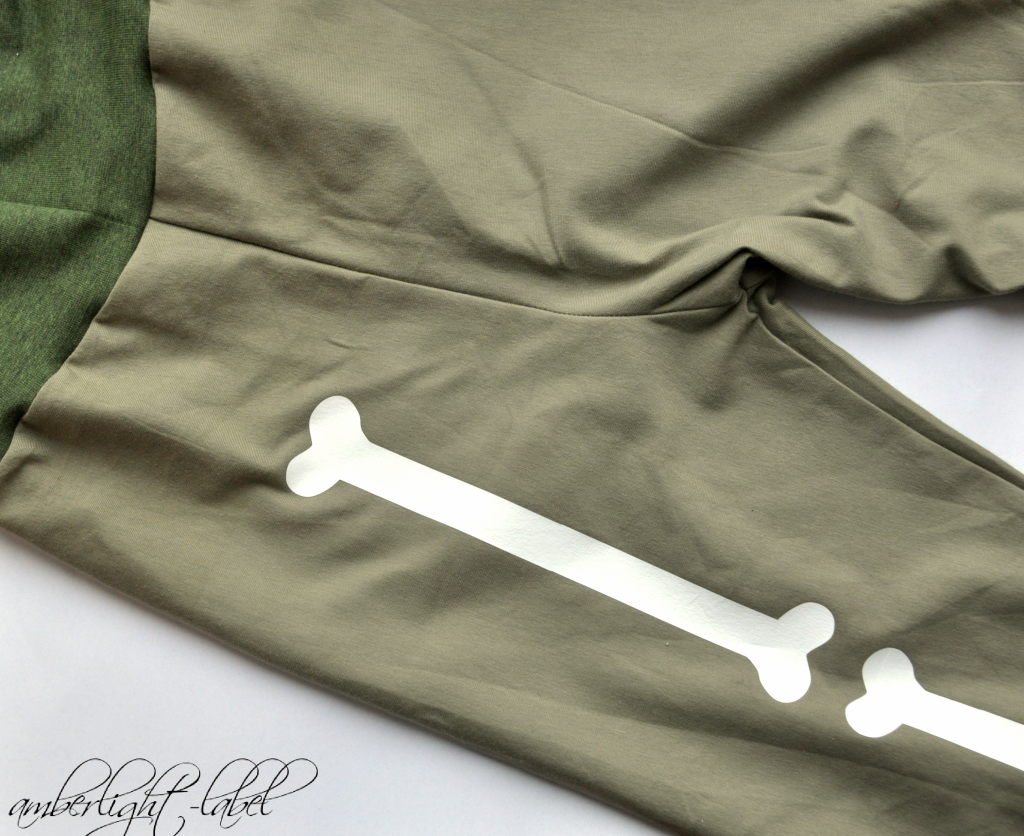 Der Jersey in der richtigen Brachiosaurus-grau-grün-Farbe habe ich aus dem Vorteilspaket von Rijs Textiles, die Bündchen vom Stoffmarkt 2020 in der eigenen Stadt. Damit es nicht ganz so langweilig wird und wenigstens ein bisschen Faschingskostüm-Charakter bekommt, wurden auf ein Bein Dinosuarierknochen geplottet. Die dazugehörige Plotterdatei “Halloween skeleton bones” von der US-Amerikanerin Catarina Gardner, erhältlich im Silhouette Store, erlaubt eigentlich ein ganzes Skelett-Kostüm und ich bin gespannt, ob ich das irgendwann nochmal umsetze.