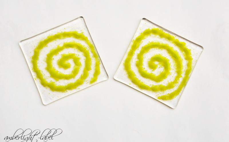 Als drittes Großprojekt habe ich mich beim Glaskunst-Workshop für zwei quadratische Untersetzter entschieden und durfte dabei statt der zu schneidenden Glasstückchen ein Glasgranulat verwenden. Die Berge der Spiralform sahen vor dem Brand überraschend hoch aus und ich bin froh, dass die Form dennoch so klar geblieben ist.