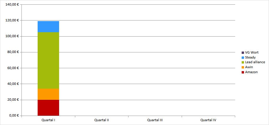 Der Warenwert erreichte im ersten Quartal für die Rezensionen 83,69 €. Dazu gehörten die Buch- und Hörspielrezensionen “Kuschelflosse – Der verhexte Blubberblitz-Besuch“*, “Patchworken und Quilten: Das Grundlagenbuch“*, “Das kleine Nähcafé am Fluss“*, “Schnelle Alltagsküche: Mehr als 60 Kochideen vom Land“* und “Geschenke aus dem Garten“*. Außerdem habe ich nach langer Zeit mal wieder ein Produkt rezensiert und dafür den Rucksack Adventurer Zurich* von Cabaia für 99,00 € bekommen. Das macht zusammen 182,99 €. Das Gewinnspiel zum 15. Bloggeburtstag war dieses Mal komplett selbst finanziert.