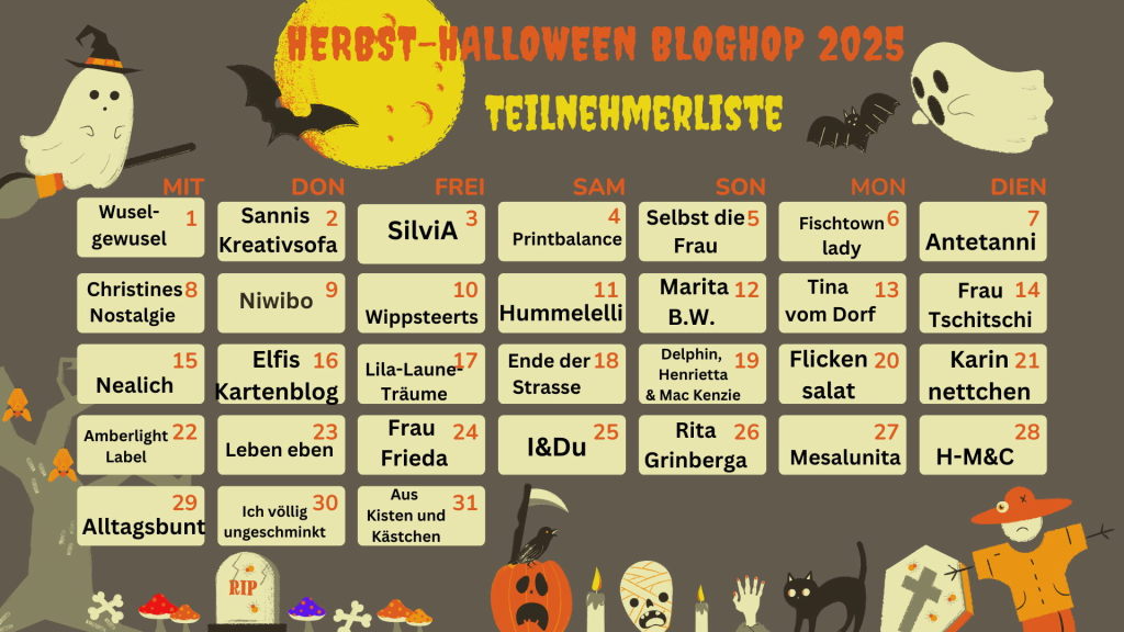 In den nun schon letzten drei Wochen haben wir – wie hier berichtet – einen völlig anderen Alltag und selbst die Blogzeit pausierte. Deshalb gab es hier auch bislang nicht den eigentlich fest eingeplanten Blogbericht zum Herbst-Halloween-Bloghoop von ulrikes smaating, der schon am 1. Oktober 2025 gestartet ist. Im Gegensatz zum letzten Jahr bin ich nicht in letzter Minute erst nachgerutscht, sondern war von Beginn an ganz offiziell dabei. Glücklicherweise ist mein eigener Tag erst am 22. Oktober 2025. Bis dahin haben wir hoffentlich in eine halbwegs wieder funktionieren Alltag zurückgefunden.