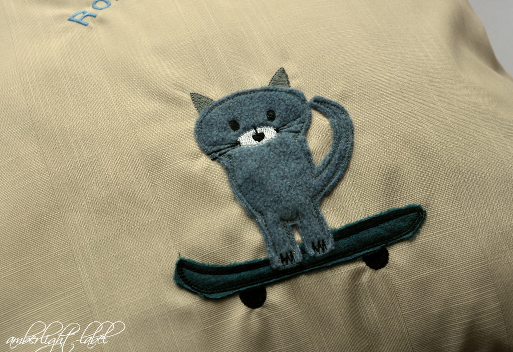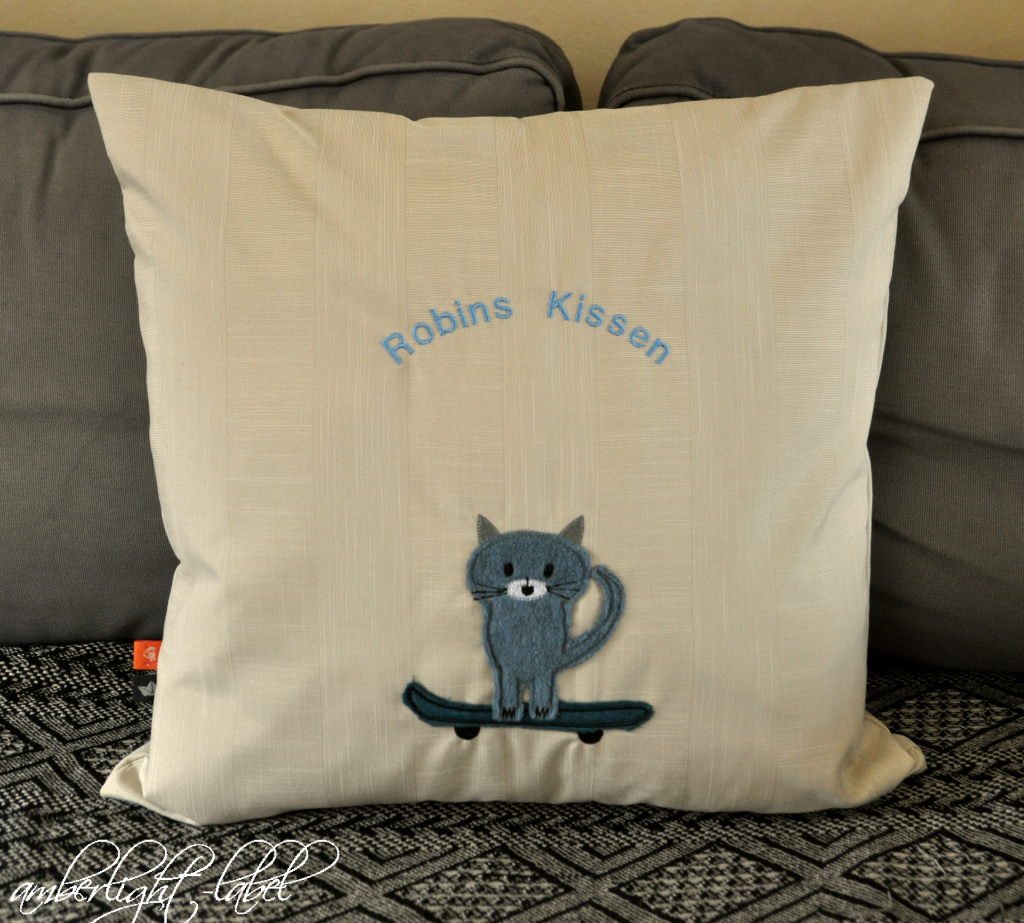 Entschieden habe ich mich daher nochmal – wie hier – für eine Skateboard-Katze aus der Stickserie “Kissas Tag” von Blaubeerstern, die ich vor Jahren mal probesticken durfte und den dazugehörigen Stoff zum vernähen bekam. Das waren noch Nähblogger-Zeiten. Inzwischen findet man nur noch vereinzelt Reste von den dazugehörigen Webbändern*.