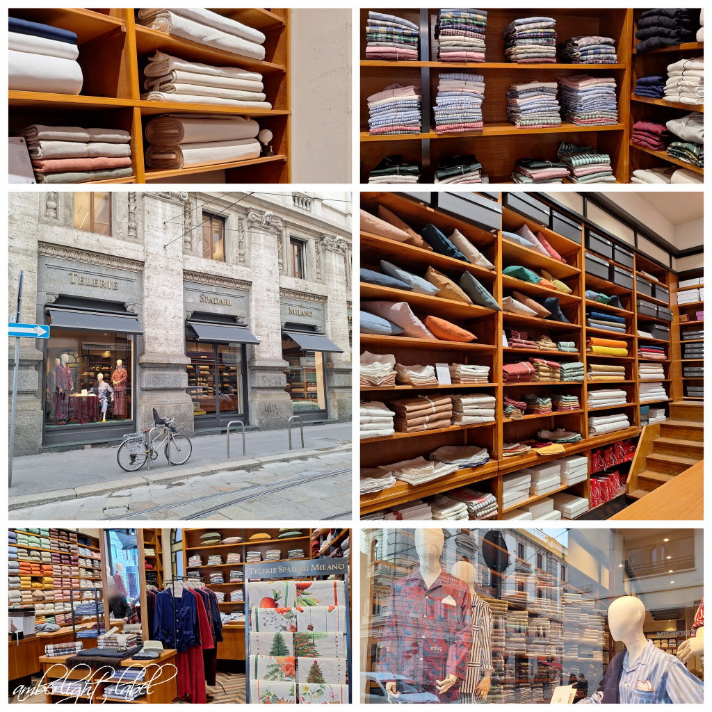 Der erste Stoffladenbesuch ließ sich nach vielen Stunden Mailänder Dom ziemlich gut in den Nachmittag integrieren, da die Stoffladensuche mit Telerie Spadari Milano einen Stoffladen nur 300 Meter vom Dom entfernt versprach. Nach nur wenigen Minuten entdeckten wir zwar das Stoffgeschäft, waren aber von der Pyjama Auslage etwas irritiert. Inzwischen habe ich nachgelesen, dass man sich dort tatsächlich vor allem maßgeschneiderte Schlafanzüge anfertigen lässt, die zwischen 150 € oder bei der Seidenvariante auch 320 € kosten können.