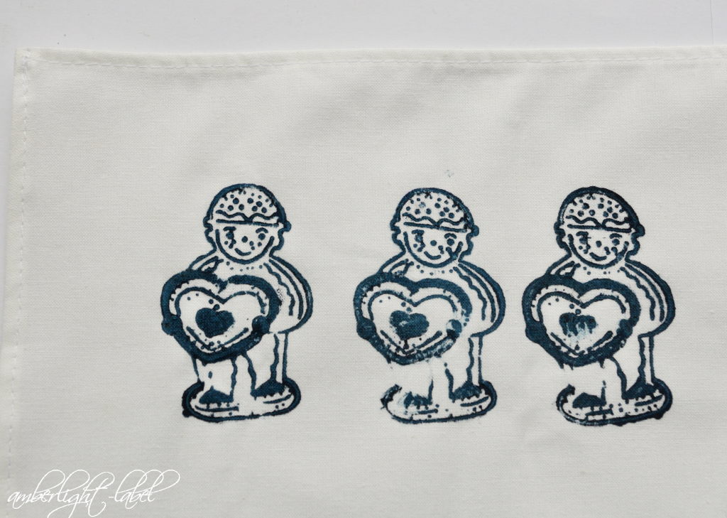 Bei meinem eigenen ausführlicher Blaudruck-Einblick war die Tochter noch ein Kleinkind und mit meinen drei Kindern gab es in Pulsnitz die Möglichkeit, wie hier mit den richtigen Blaudruckmodeln mit Stofffarbe zu stempeln. Am Ende hatten wir ein kleines Deckchen, dass von allen dreien gemeinsam gestaltet wurde und ein wunderbares Geschenk für die Großeltern im letzten Jahr werden konnte. Die Pfefferkuchenmännchen hat dabei jedes Enkelkind selbst gestempelt.