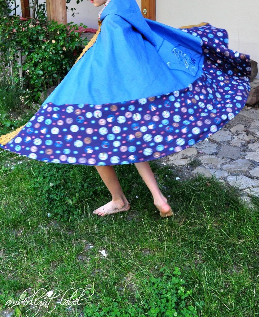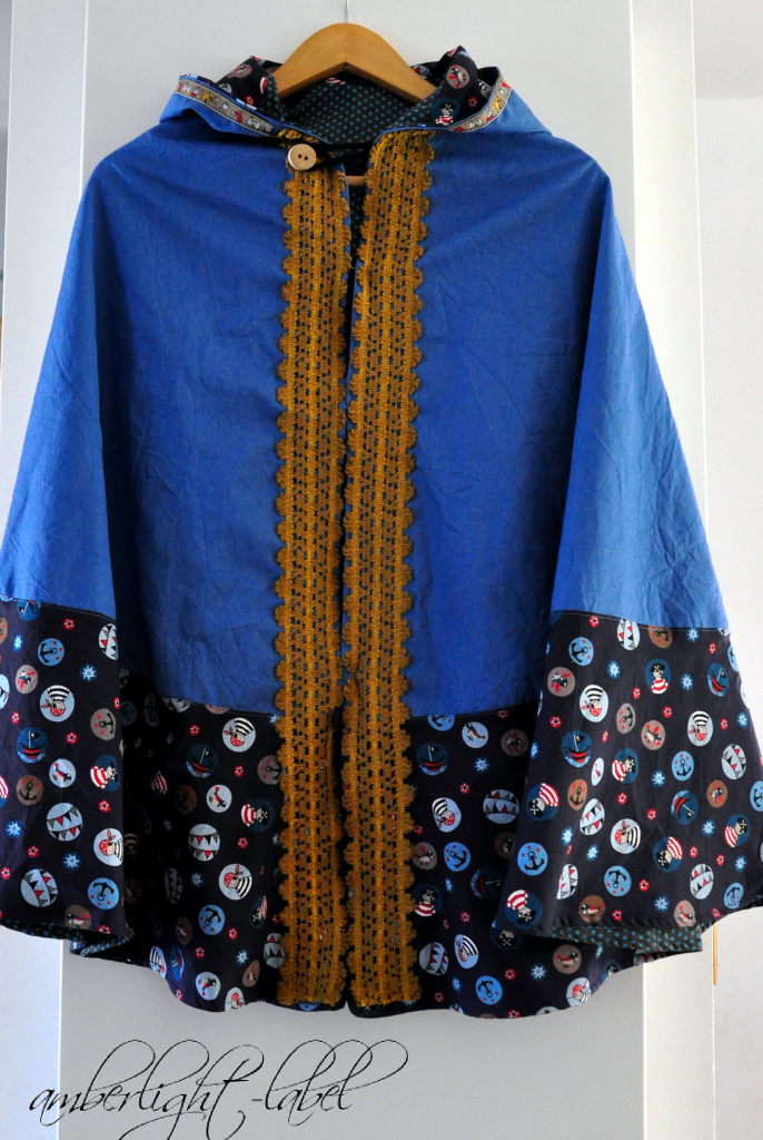 Das Schnittmuster für den Wendeumhang mit Kapuze kommt aus dem Mama-Nähbuch*, das übrigens die deutsche Ausgabe von “Growing up sew liberated“* ist. Daraus habe ich wohl bislang tatsächlich nur den Schlafsackbody genäht, als der Pfadfinder gerade mal süße zehn Monate alt war. Vernäht wurde der Baumwollstoff von Nestnadel für außen, der aber bereits nicht mehr die richtige Länge hatte, da ich das meiste davon für die Schaukelbezüge eingeplant habe. Daher gab es als breiten Bordenstoff unten den Piratenstoff von Prodyouce, der ziemlich gut zum Hansethema passte – auch wenn er ganz sicher keinen mittelalterlichen Bezug hatte. Innen reichte aber der braun-blaue Stoff aus dem Käselotti-Überraschungseinkauf. Vernähen konnte ich außerdem gleich das Ritterwebband von Susalabum aus den neuen Webbändern und – das einzige halbwegs mittelalterlich anmutende – eine breite Stickborte, deren Herkunft ich hier noch nicht verbloggt habe.