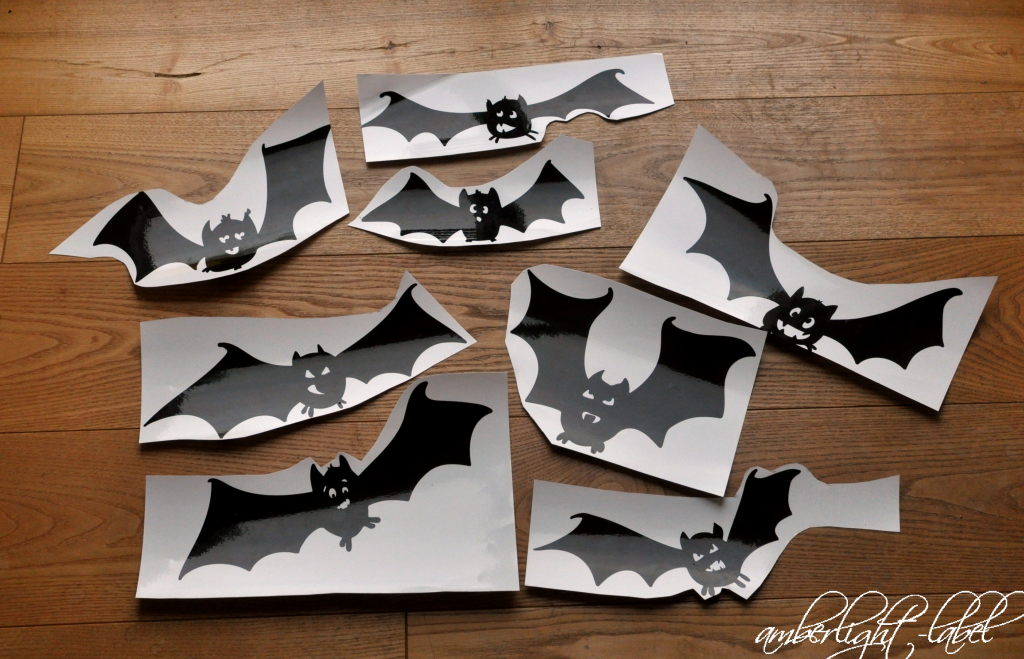 Geplottet habe ich die Datei “Kleine Fledermauskolonie” von MamasSachen. Ich mag die Gestaltung der Fledermäuse sehr und obwohl ich einige Versuche brauchte, bis ich die richtige Schnitteinstellung gefunden hatte, entgitterten sich die Dateien dann ganz schnell. Der Schwarzeffekt auf den Fensterscheiben, bei denen die Folien nun ganz ohne Kleber halten, ist auch tagsüber ganz großartig.