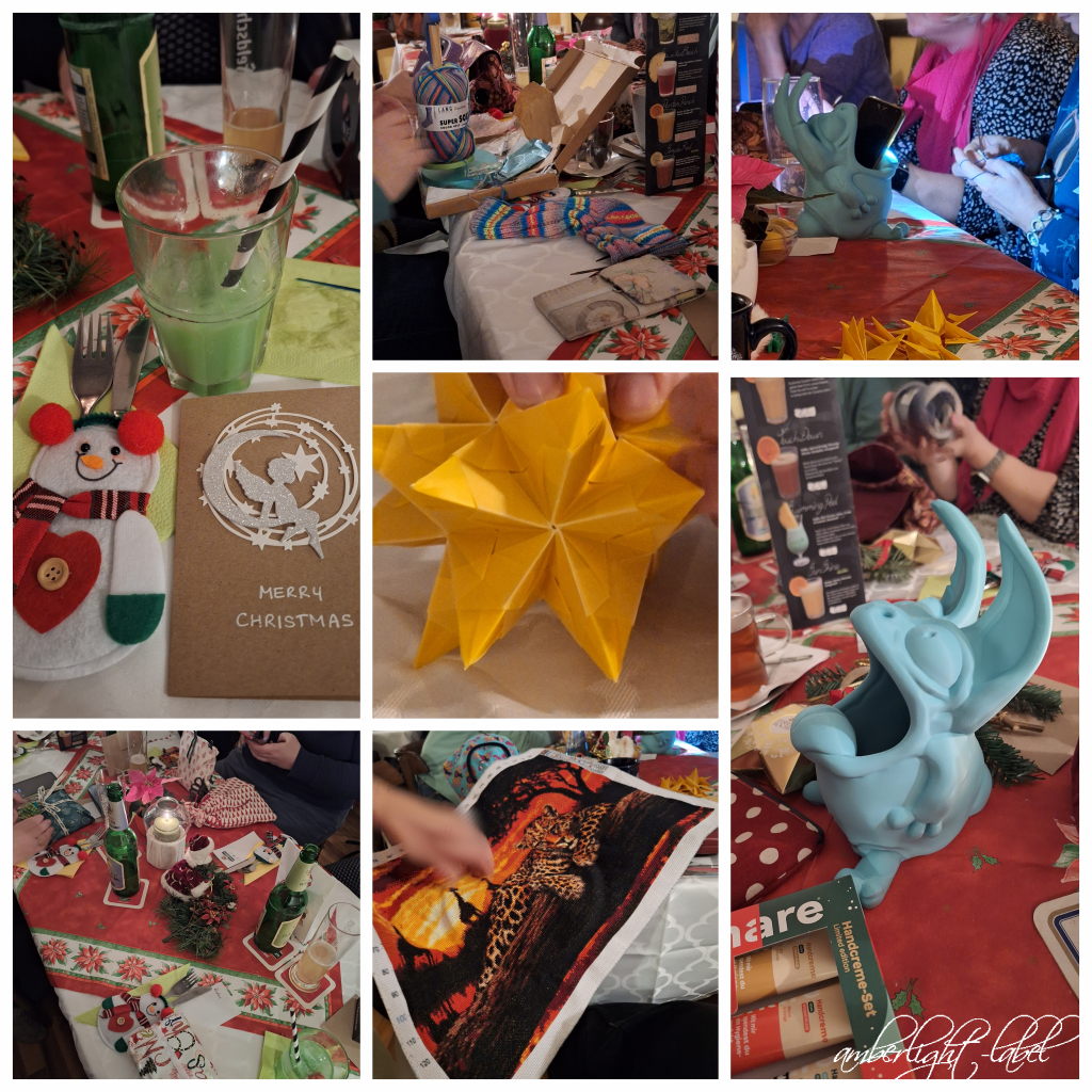 Dort wurde auch schon erwähnt, dass sich bei der Weihnachtsfeier 2025 friemeleien, aprikaner, clauchichi, dorooutoftheblue, schuhpeg , mitnadelundfaden, kremplinghaus, orneedd, resizegenadelt und ina_zkar treffen konnten und damit auch einige ehemalige Nähblogger, die man schon lange nicht mehr gesehen hat. Um so schöner war es, dass sich bei dieser Nicht-Näh-Runde die Möglichkeit dazu ergab. So saß ich gegenüber von aprikaner und clauchichi, bei denen es viel zu berichten gab. Die Wichtelrunde brachte mir selbst dann ein unglaublich gut passendes Präsent von Kremplinghaus.