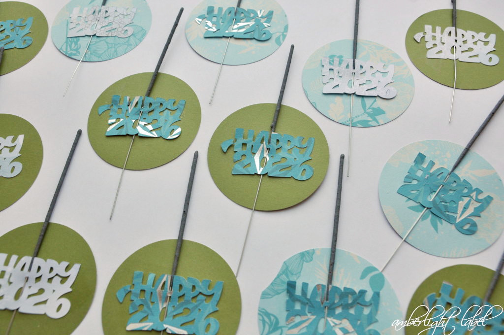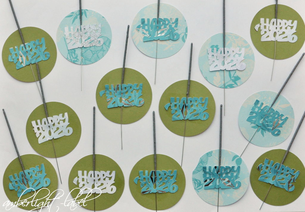 Passenderweise hatte ich die “Happy 2026” von Mamassachen gleich in so großer Menge geplottet, dass ich genügend Bastelmaterial da hatte. Ganz ohne Naschwerk wurde es dieses Jahr nur ein Wunderkerzengruß. Dazu nutze ich den Jumbostanzer* mit 3 Zoll, stempelte auf die Rückseite unseren feinen Adressstempel von bastisRike, die unseren Hochzeitstempel gestaltet hat und fädelte die Wunderkerze in den Plott ein, der anschließend aufgeklebt wurde.