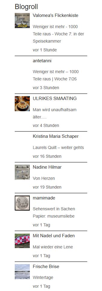 Damit habe ich nun auf der WordPress-Seite endlich wieder eine funktionierende Blogroll. Falls der Herr Programmierer ganz motiviert wäre, würde ich mir zwar noch die üblichen Textschnipsel der Blogbeiträge wünschen und vor allem eine Einklappfunktion bzw. ein “Alles anzeigen”, wie in der Bloggerwelt, aber das wäre alles Zusatz. Das sich die Blogroll so einfach anlegen lässt und vor allem chronologisch sortiert. macht mich wirklich glücklich.